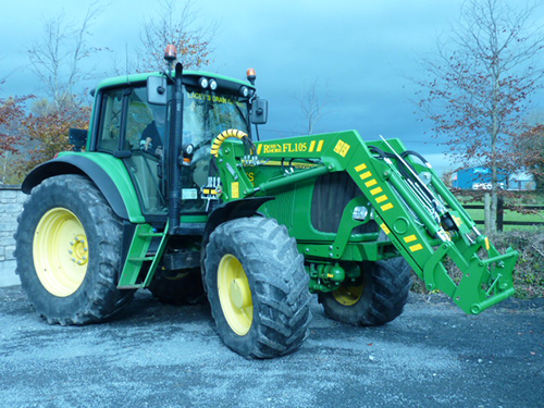 The Front Loader FL105 is suitable for 6 Cylinder tractor range from 115 upwards. Has a lifting height of 3.75 metres underneath base of implement. Maximum payload is 1810 kgs at full height. The FL105 comes equipped with single lever operation (joystick).